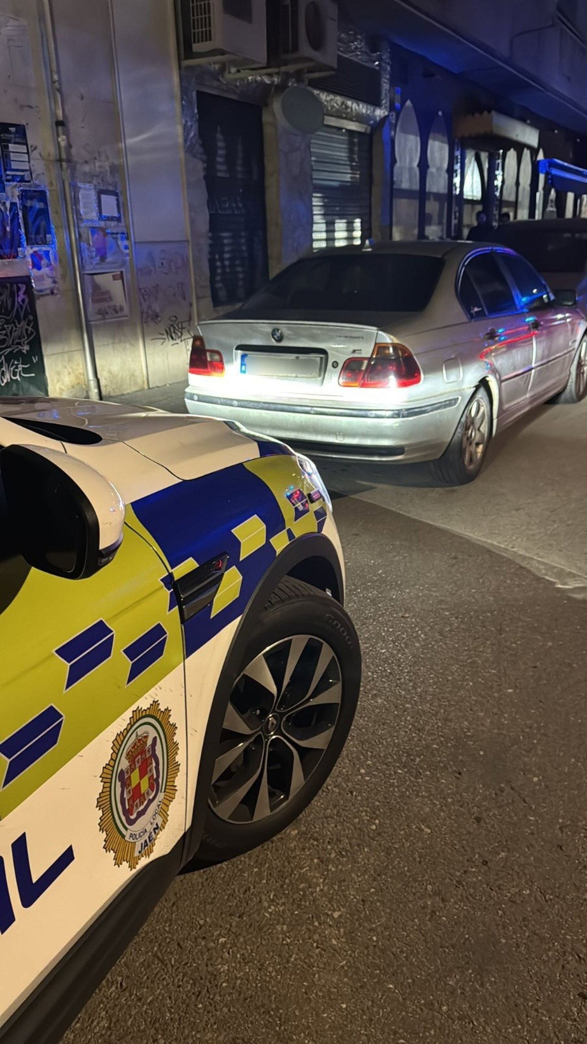 Un vehículo de la Policía Local de Jaén junto al coche del conductor detenido. - AYUNTAMIENTO DE JAÉN