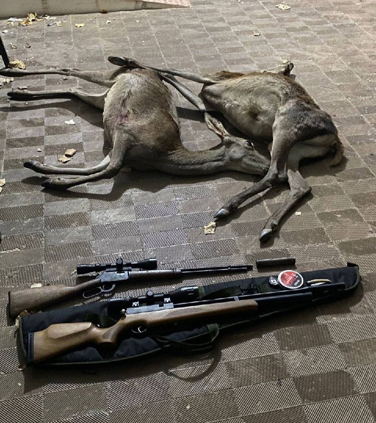 Así las cosas, al observar que el sospechoso se mostraba muy nervioso procedieron al registro del vehículo, lo que permitió localizar en su interior dos reses cervunas que habían sido abatidas recientemente. Igualmente, en el asiento trasero del mismo había una carabina de aire comprimido.