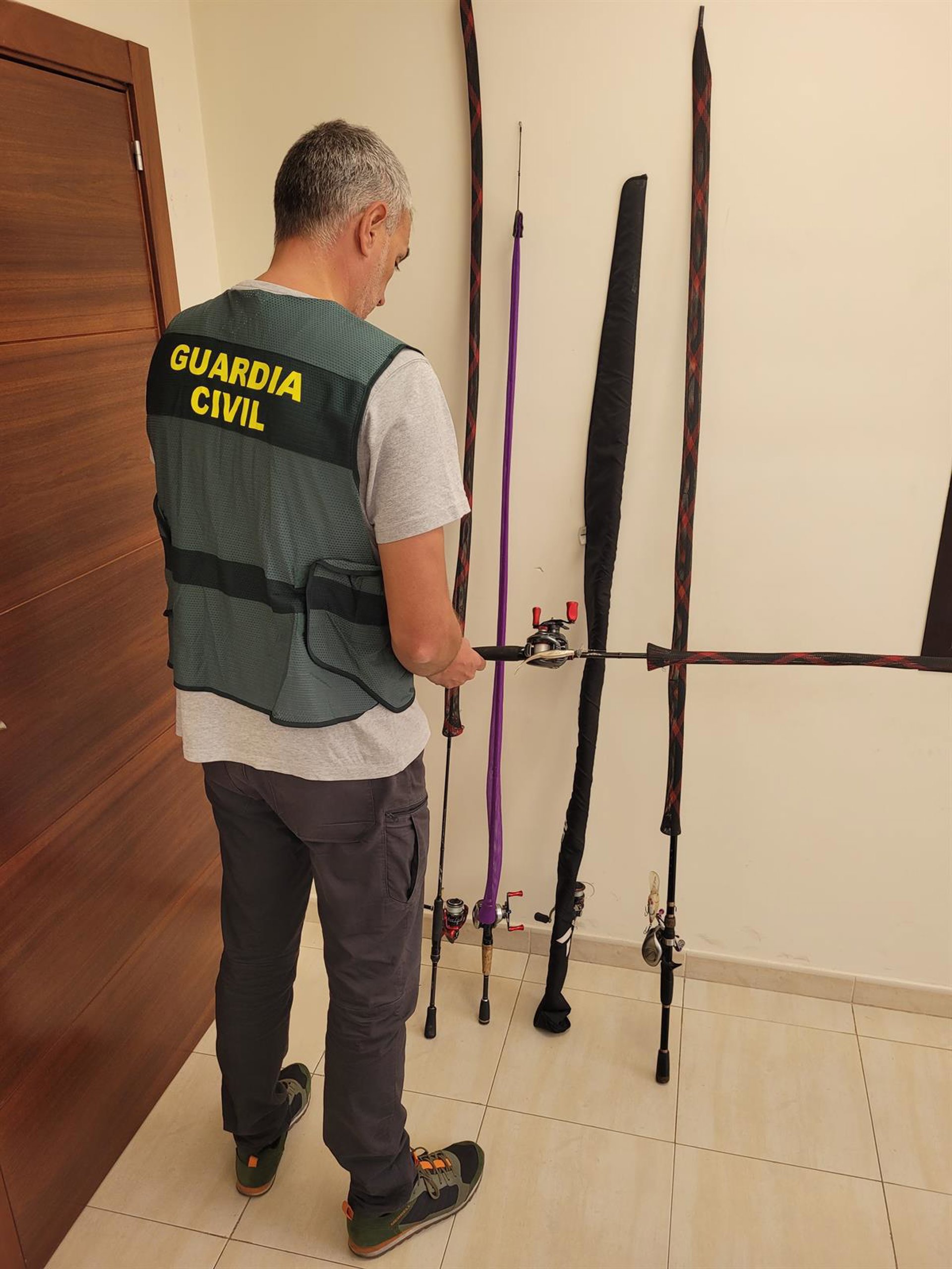 Un agente junto a las cañas de pescar sustraídas del vehículo. - GUARDIA CIVIL