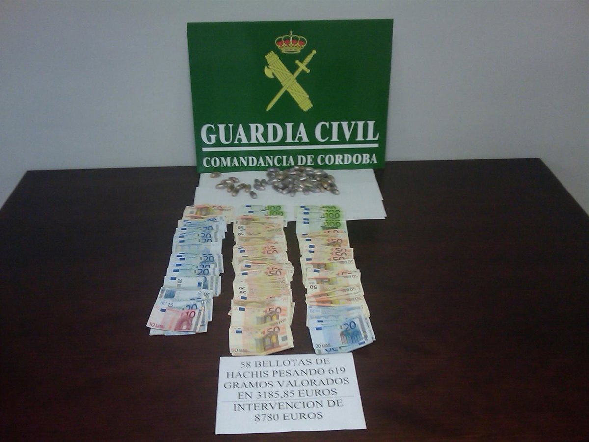 Según indica la Guardia Civil en una nota, los agentes han localizado en el interior del vehículo 1.240 dosis de resina de hachís, preparada para su distribución y venta al 'menudeo' en 58 bellotas, y dos bolsitas conteniendo más de 8700 euros en billetes fraccionados.