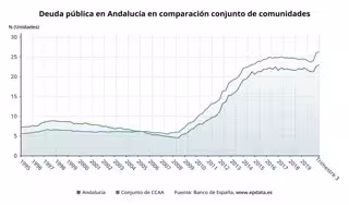 Los 35.236 millones de euros de la deuda de Andalucía supone su cifra más baja desde 2017, que se cerró en 34.260 millones. La deuda de Andalucía la sitúa como la tercera comunidad en términos absolutos, aunque en términos relativos, un 23% del PIB de Andalucía, supone estar 3,3 puntos por debajo de la media autonómica, que es de un 26,3% del PIB.