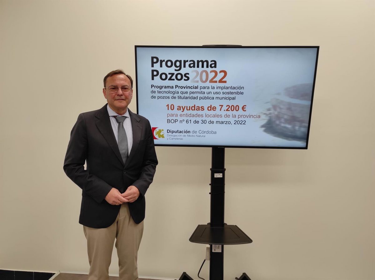 El delegado de Medio Natural de la Diputación de Córdoba, Francisco Palomares, ha presentado este miércoles la convocatoria de subvenciones, dotada con 72.000 euros, para la implantación de tecnología que permita el uso sostenible de pozos de titularidad municipal para el año 2022, dirigido a municipios menores de 20.000 habitantes.