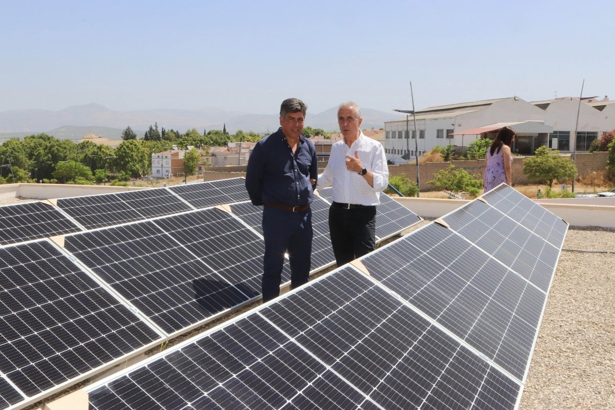 El delegado de Presidencia, Asistencia Económica con los Municipios y Mancomunidades de la Diputación de Córdoba, Rafael Llamas, y el alcalde de Lucena, Juan Pérez, han visitado este martes las obras de instalación de 130 paneles solares que la institución provincial ejecuta en el CEIP Al-Yussana con cargo al programa de proyectos singulares de Economía Baja en Carbono.