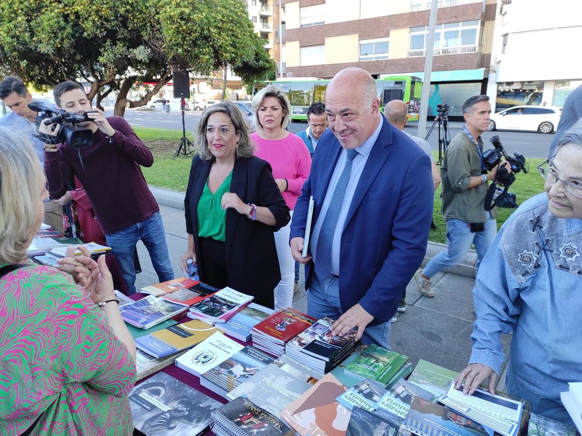 El presidente de la Diputación, Antonio Ruiz, visita una de las mesas en las que se reparten libros a los ciudadanos que se acerquen. - EUROPA PRESS