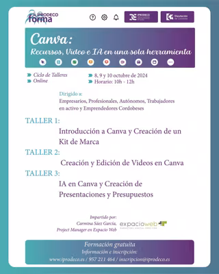 Conseguir destacar en el mercado digital a pesar de ser una pequeña empresa o negocio familiar mediante la creación de contenidos que sean visualmente atractivos es uno de los principales objetivos del ciclo de talleres online 'Canva: recursos, vídeo e IA en una sola herramienta', una acción formativa impulsada por la Diputación de Córdoba, a través del Instituto Provincial de Desarrollo Económico (Iprodeco).