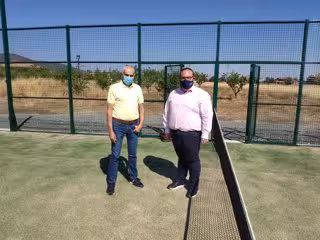 El diputado provincial de Deportes, Manuel Guirado, junto al alcalde de Albuñán (Granada), Benito Morillas, han visitado las últimas infraestructuras deportivas construidas en el municipio, una pista de pádel y un parque biosaludable que han contado con aportaciones de la Diputación.