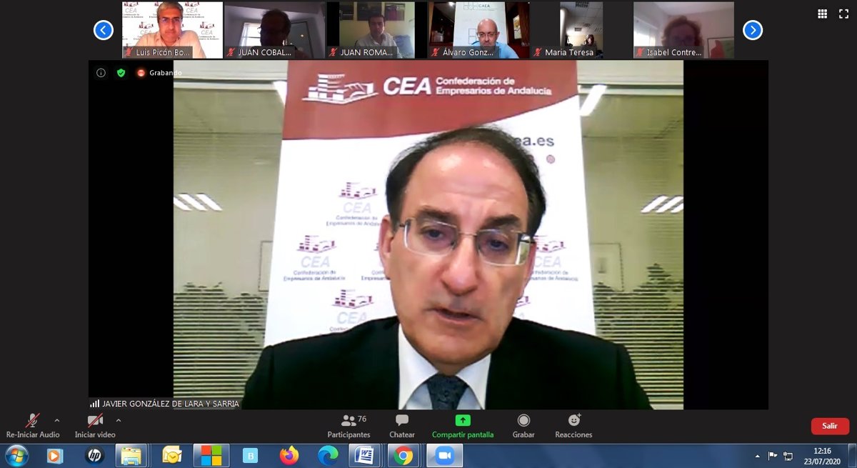 Imagen de la reunión telemática de los órganos directivos de la CEA. En primer plano su presidente, Javier González de Lara. - CEA