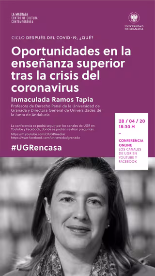Al final de la intervención de la profesora Ramos Tapia, se podrá realizar preguntas a la interviniente a través del chat de ambas redes sociales, según explica en un comunicado la UGR. 'El ciclo Después del covid-19 ¿qué?' es una actividad del Vicerrectorado de Extensión Universitaria y Patrimonio y forma parte de su nueva propuesta de debates y contenidos online.