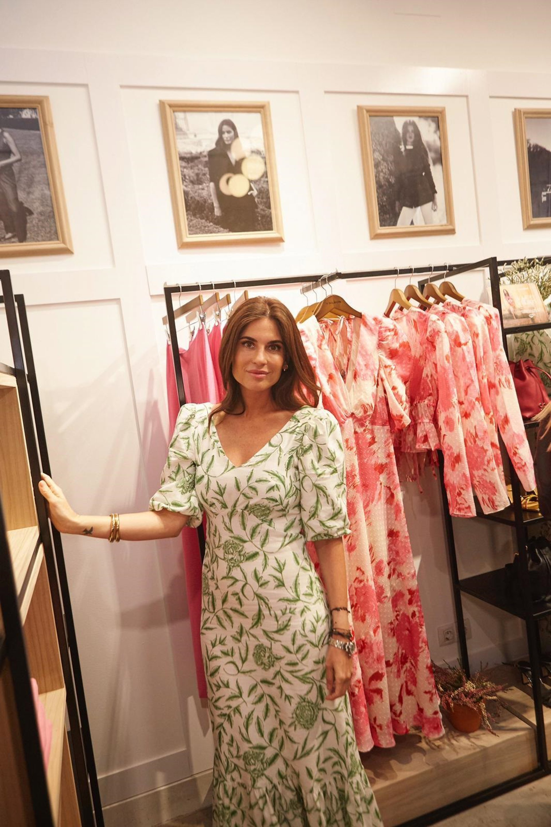 Montes ha elegido para la presentación una de las propuestas de la colección, un vestido estampado clavel verde esmeralda muy intenso sobre fondo blanco roto y estampado sobre una base de tejido de lino mezcla, con una caída que "favorece la figura femenina".