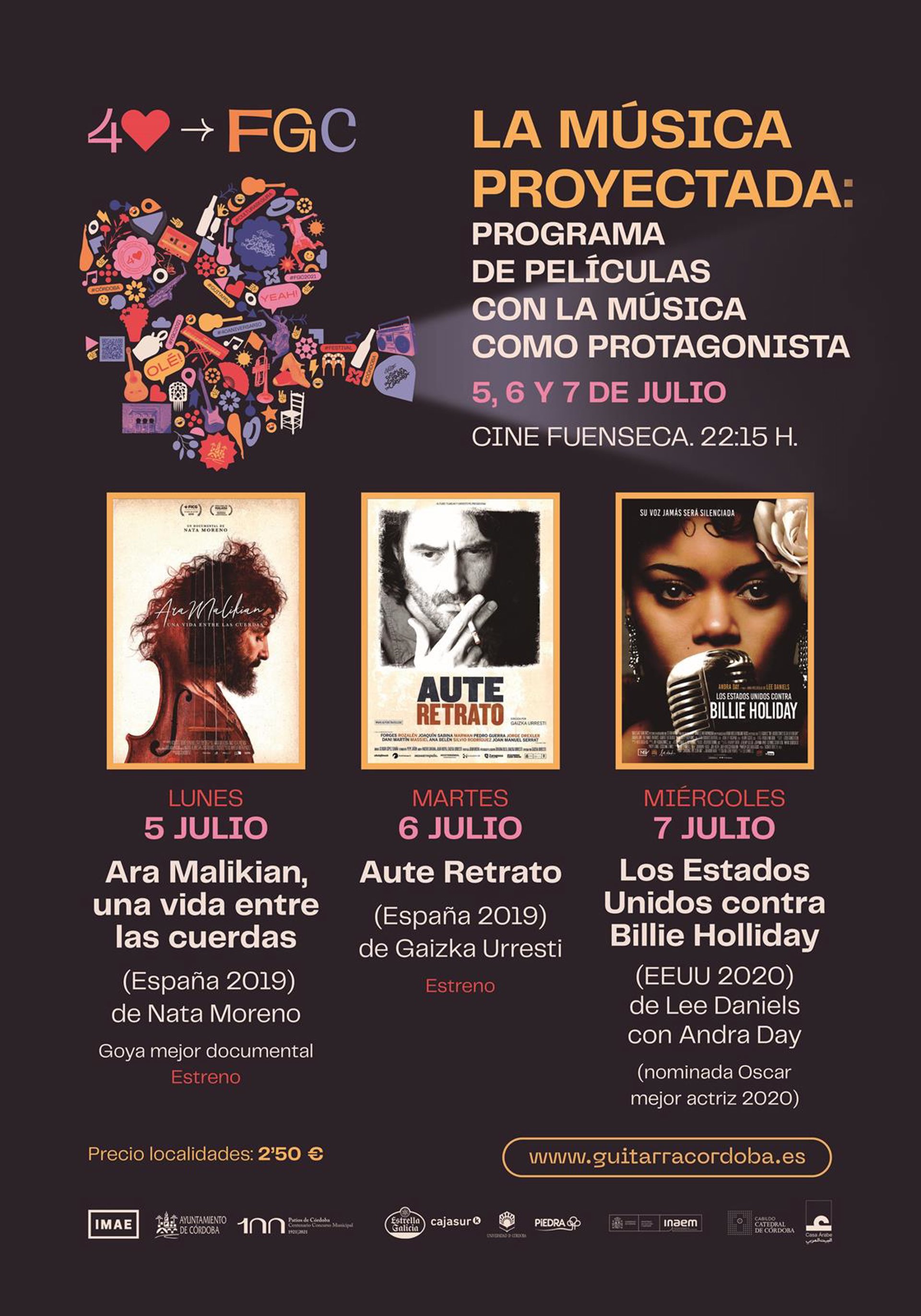 'La música proyectada', el aperitivo de cine que sirve de preámbulo cada año al Festival de la Guitarra de Córdoba, presenta en esta 40 edición de la cita con las seis cuerdas dos documentales y una película en torno a tres destacadas figuras de la música. De este modo, el violinista Ara Malikian da comienzo este lunes a dicho ciclo, que se completa con el cantautor Luis Eduardo Aute y la estrella del jazz Billie Holiday.