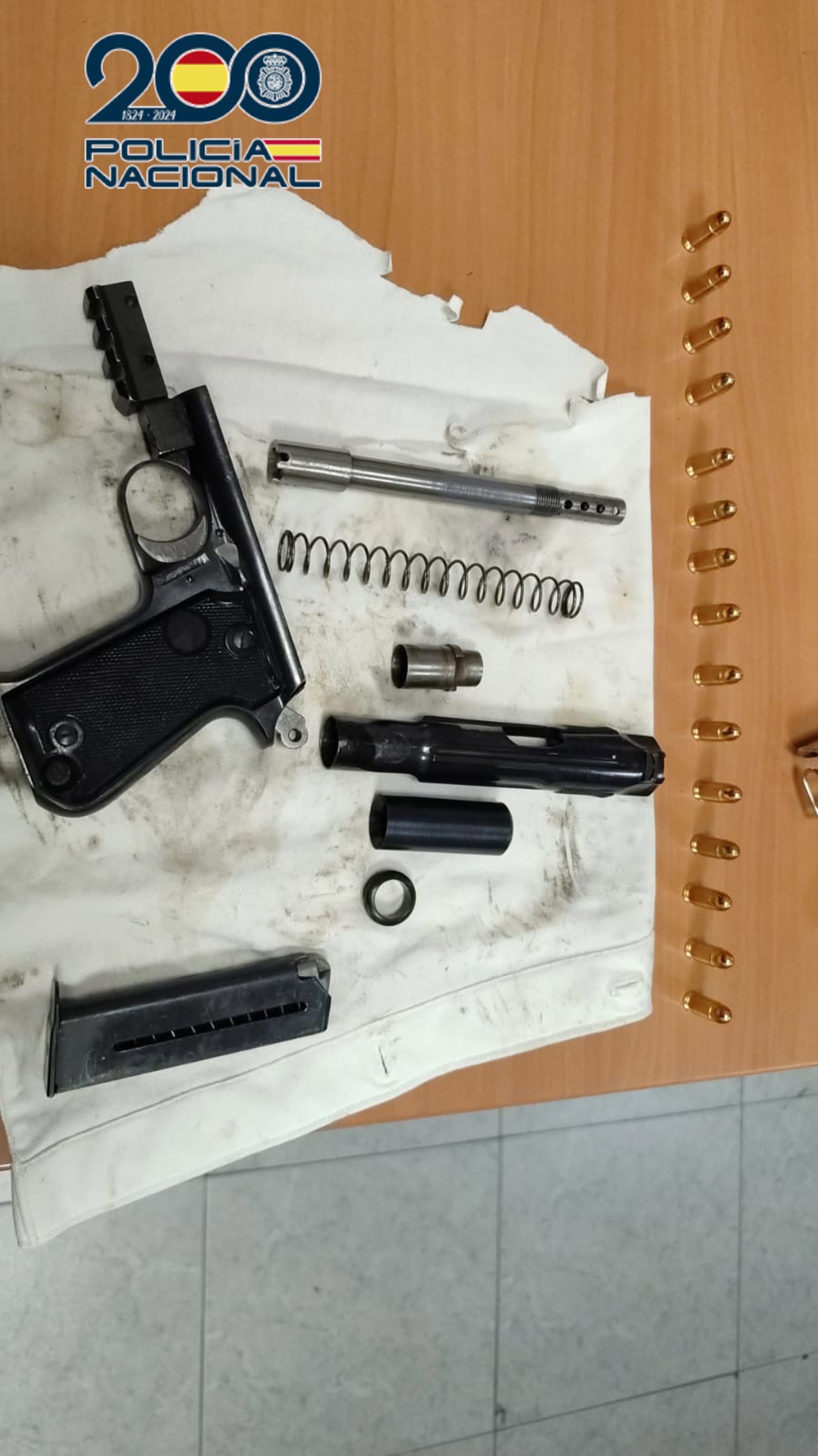 Al registrarlo, encontraron en debajo del asiento del copiloto una pistola desmontada dentro de una bolsa junto con 15 cartuchos del calibre 7,65 milímetros. No obstante, fue trasladado a dependencias policiales para llevar a cabo "una inspección más minuciosa" y dada la multitud de personas que se estaban congregando "haciendo más difícil la intervención", lo que llevó también a solicitar la colaboración de Policía Local para aumentar la seguridad de los agentes.