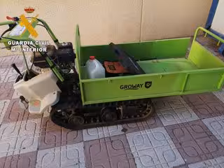 Los ladrones habían fracturado el candado de acceso a la finca y habían forzado la puerta de acceso al cuarto de aperos que hay junto al invernadero y le habían robado una carretilla transportadora tipo oruga de color verde cuya plataforma había sido modificada y el color verde de la plataforma tiene una tonalidad diferente.
