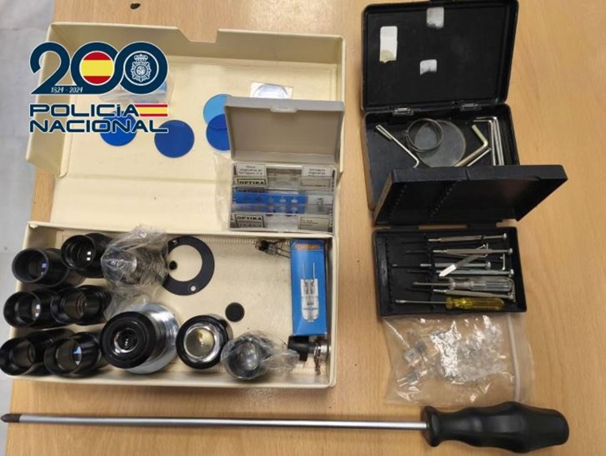 Una vez en dependencias policiales y tras la realización de diversas gestiones se pudo localizar a una persona de la empresa perjudicada, que manifestó que "le habían fracturado el cristal delantero derecho de su furgoneta echando en falta numerosos objetos". Entre el material con el que fue sorprendido esta primera persona se encontraban dos microscopios profesionales, 24 oculares, y tres botes con herramientas específicas para dichos microscopios.