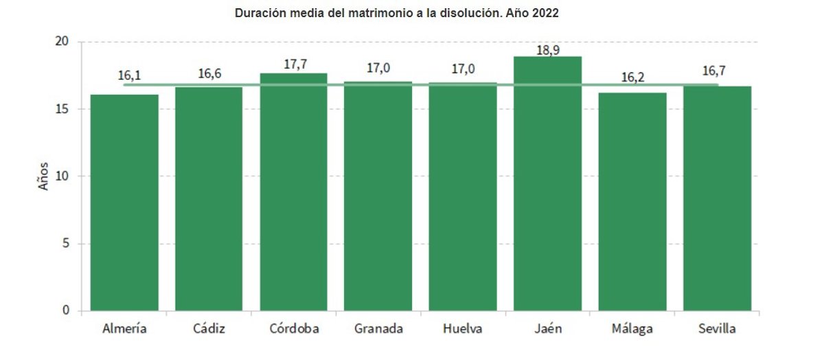 La duración media de los matrimonios disueltos fue de 16,8 años. Por provincias, este indicador tomó su máximo en Jaén (18,9 años) y el mínimo en Almería (16,1 años).