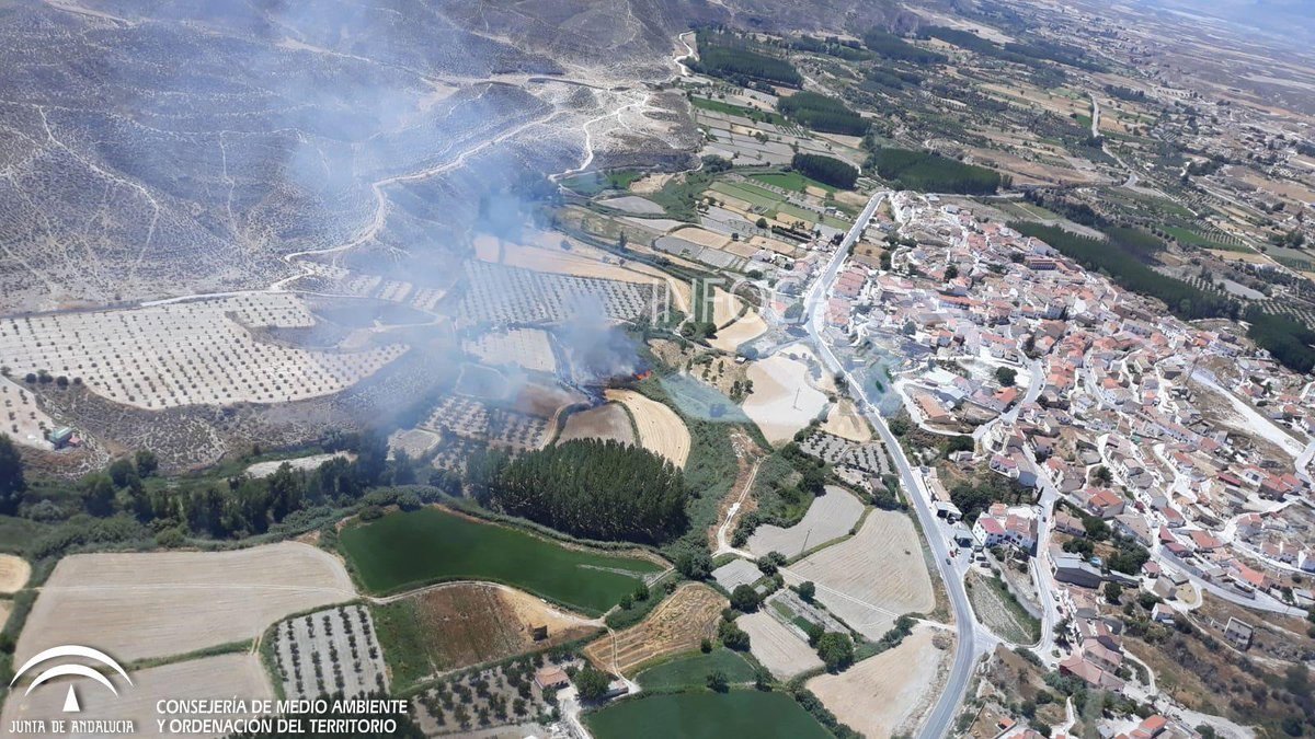 Efectivos del Infoca trabajan en la extinción de un incendio forestal declarado sobre las 13,20 horas de este lunes en Castilléjar (Granada) y que se ha dado por estabilizado una hora y media después.