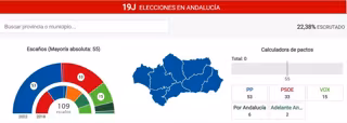 Con el 22,38% escrutado, el PP gana las elecciones autonómicas en Andalucía y consigue 53 escaños, logrando un 40,35% de los votos. Esta cifra supone 27 más que los 26 parlamentarios obtenidos en los comicios de 2018 y le dejan a dos diputados de la mayoría absoluta, fijada en 55 escaños.