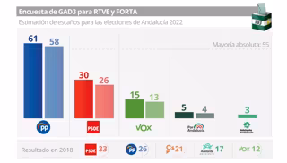 El Partido Popular ganaría las elecciones autonómicas de este domingo 19 de junio en Andalucía con mayoría absoluta y entre 58 y 61 diputados y el PSOE lograría su peor resultado histórico con entre 26 y 30 escaños, según un sondeo electoral de GAD3 para RTVE y la FORTA.