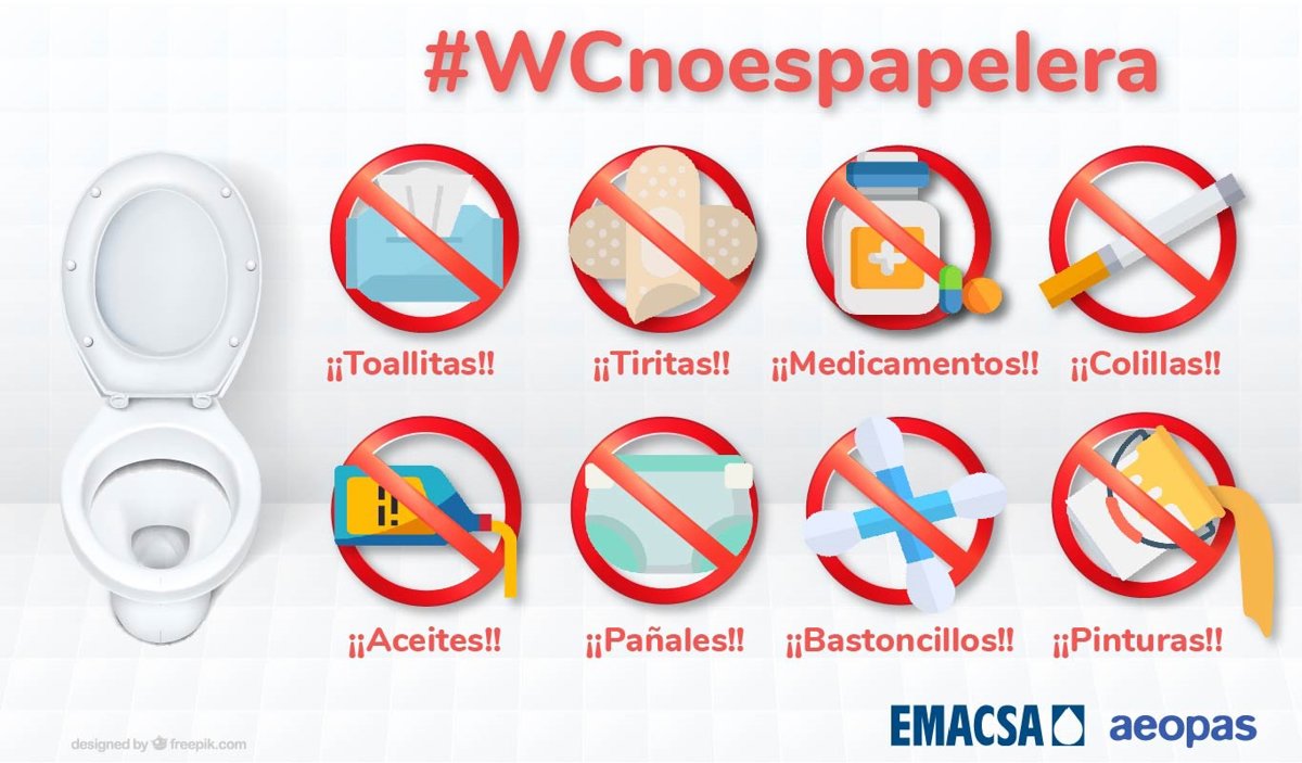 Bajo el lema '#WCnoespapelera', Emacsa trata de concienciar a la ciudadanía sobre los efectos nocivos que tienen determinados objetos o productos arrojados al inodoro, al tiempo que pide el compromiso ciudadano para no convertir el mundo en un gran vertedero.