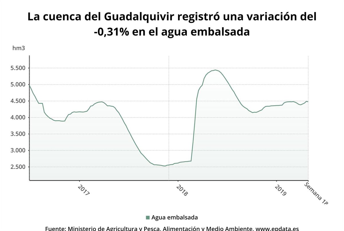 De esta forma, la cuenca del Guadalquivir presenta 4.476 hectómetros cúbicos embalsados; la Mediterránea, 771; la de Tinto-Odiel-Piedras, 186, y la de Guadalete-Barbate, 1.060 hectómetros cúbicos.