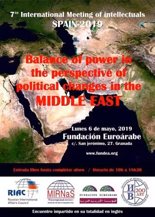 El próximo 6 de mayo se celebra en Granada, en la sede de la Fundación Euroárabe, el 7 Encuentro Internacional de Intelectuales que este año estará dedicado a analizar los 'Equilibrios de poder desde la perspectiva de los cambios políticos en Oriente Medio" (Balance of power in the perspective of political changes in the Middle East), para el que se contará con una importante presencia de expertos de universidades y centros de investigación de España, Reino Unido, Rusia y Turquía.