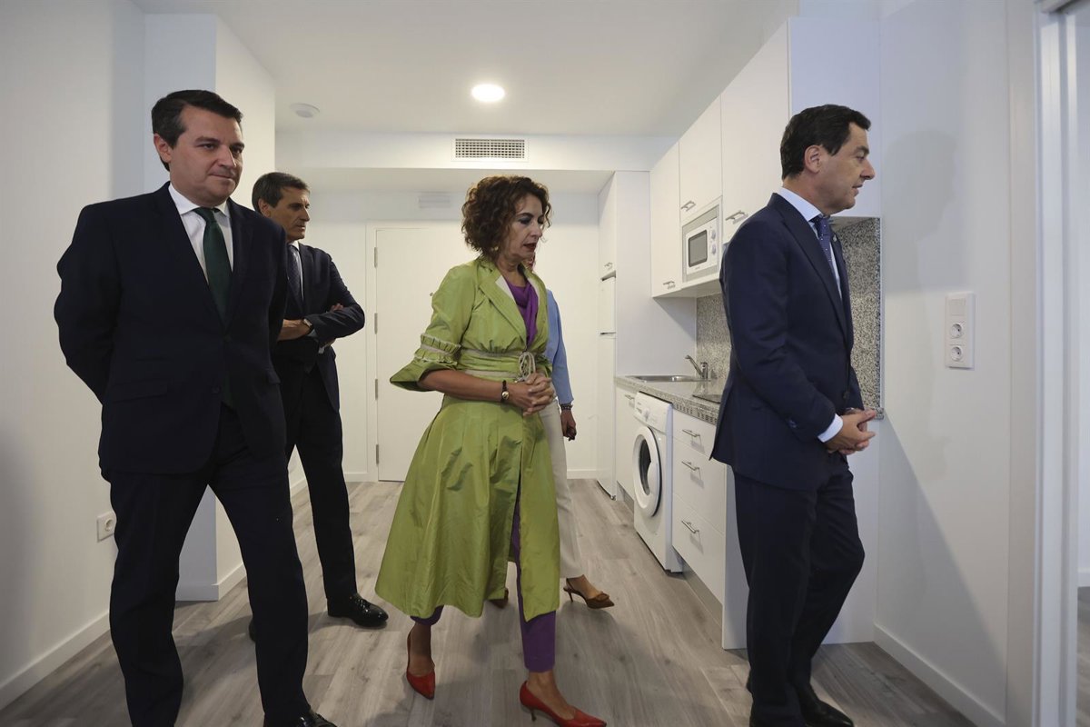 El presidente de Andalucía, Juanma Moreno; la vicepresidenta del Gobierno, María Jesús Montero, y el alcalde de Córdoba, José María Bellido, en el acto de entrega de llaves de la segunda fase de los alojamientos Sama Naharro para mayores en Córdoba. - MADERO CUBERO/EUROPA PRESS