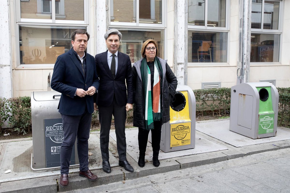 Lorite (centro), junto a Fernández (izda.), ante varios contenedores soterrados en Lucena. - DIPUTACIÓN DE CÓRDOBA