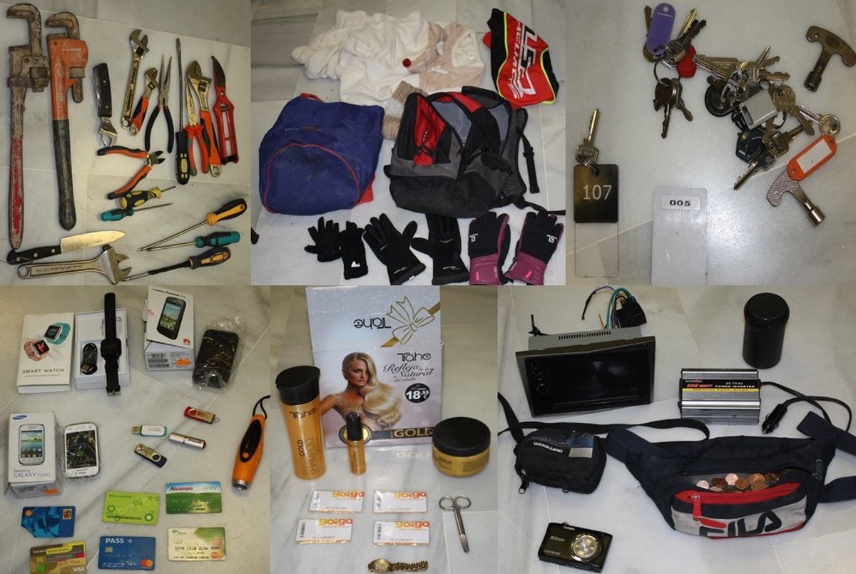 Una vez que localizaron a este individuo, observaron que tenía dos mochilas que guardaban multitud de objetos, entre ellos dos teléfonos móviles, numerosas tarjetas de telefonía móvil, varios productos de cosmética, herramientas, una cámara de fotos, componentes informáticos y otros efectos. Algunos de estos efectos provenían de otro establecimiento cercano cuyos sistemas de seguridad habían sido violentados esa misma noche.