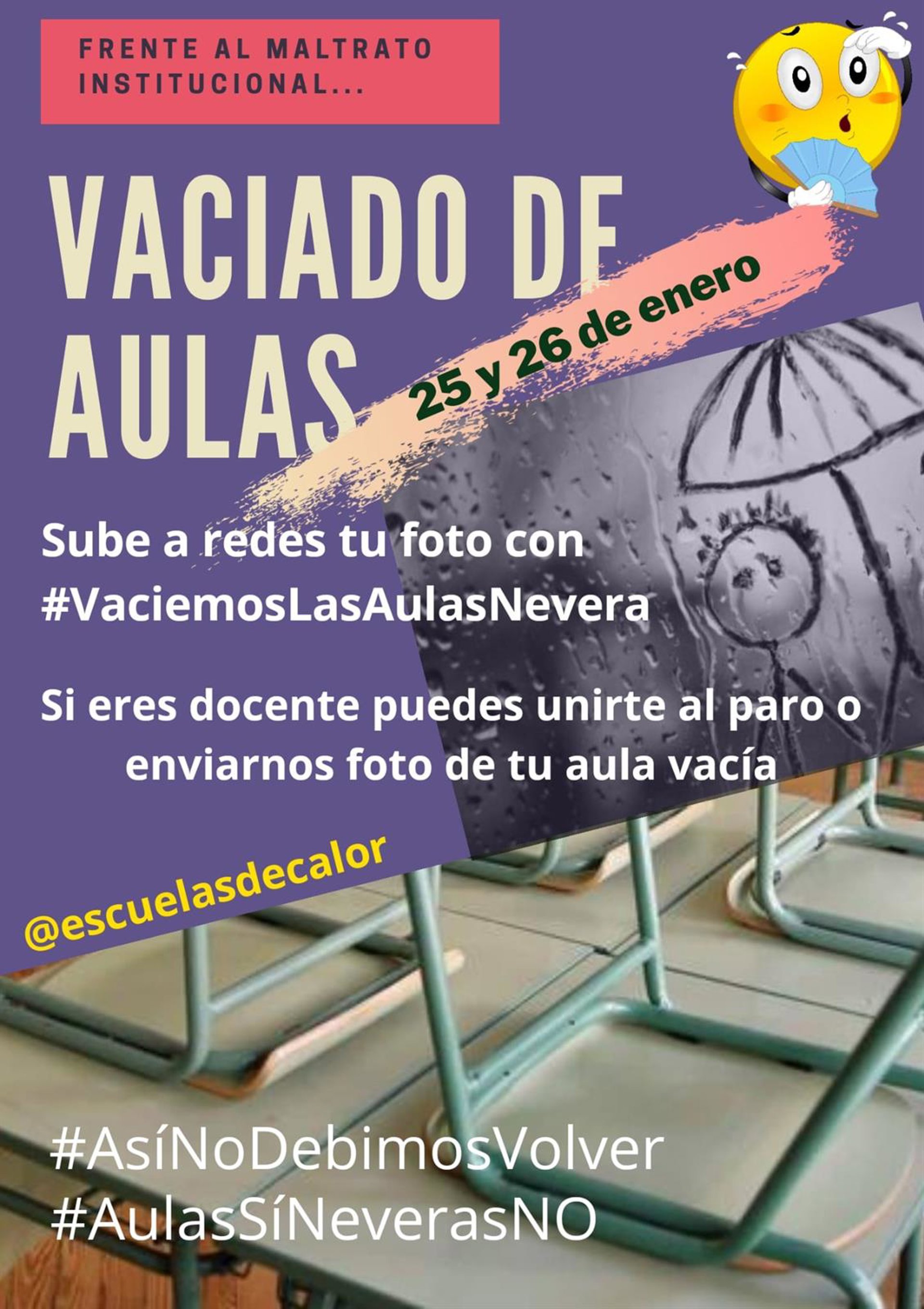 La Plataforma Escuelas de Calor ha convocado para los próximos 25 y 26 de enero una protesta de "aulas vacías" para mostrar "el rechazo a la gestión infame" que la Consejería de Educación y Deporte está haciendo en los centros educativos y en "repulsa" por el "maltrato al que somete a toda la comunidad educativa con frío, viento, lluvia, virus", mientras "sigue sin hacer nada".