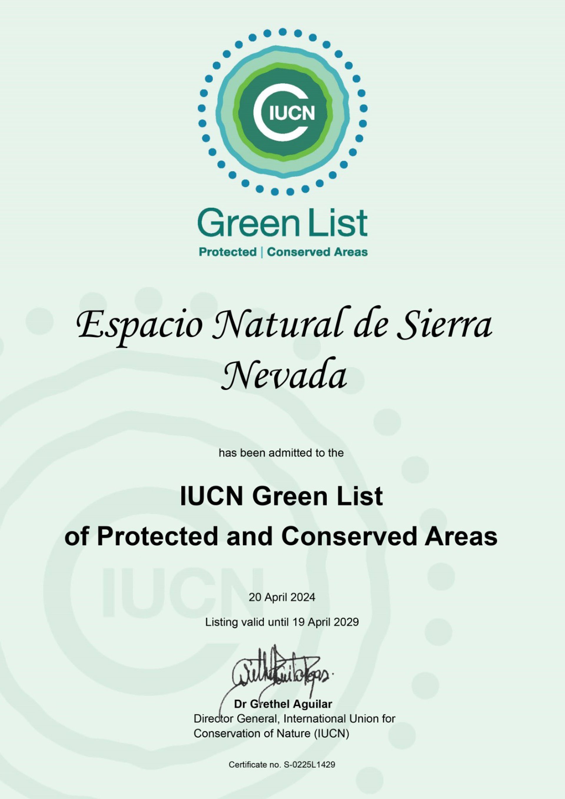 Certificado recibido por la Junta desde la UICN confirmando la renovación de Sierra Nevada dentro de su lista verde. - JUNTA DE ANDALUCÍA