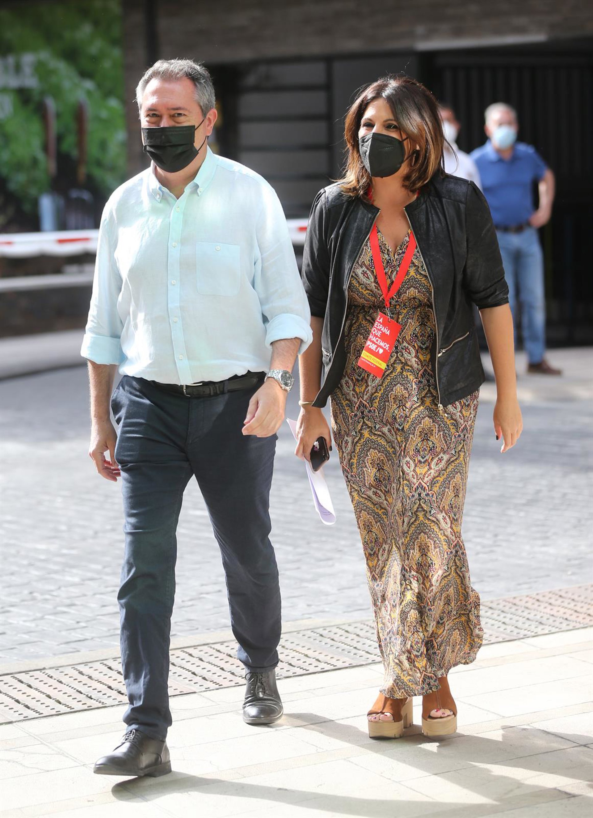 El alcalde de Sevilla, Juan Espadas, este sábado en Madrid, a su llegada a la reunión del Comité Federal del PSOE, acompañado de la portavoz parlamentaria autonómica, Ángeles Férriz. - Isabel Infantes - Europa Press