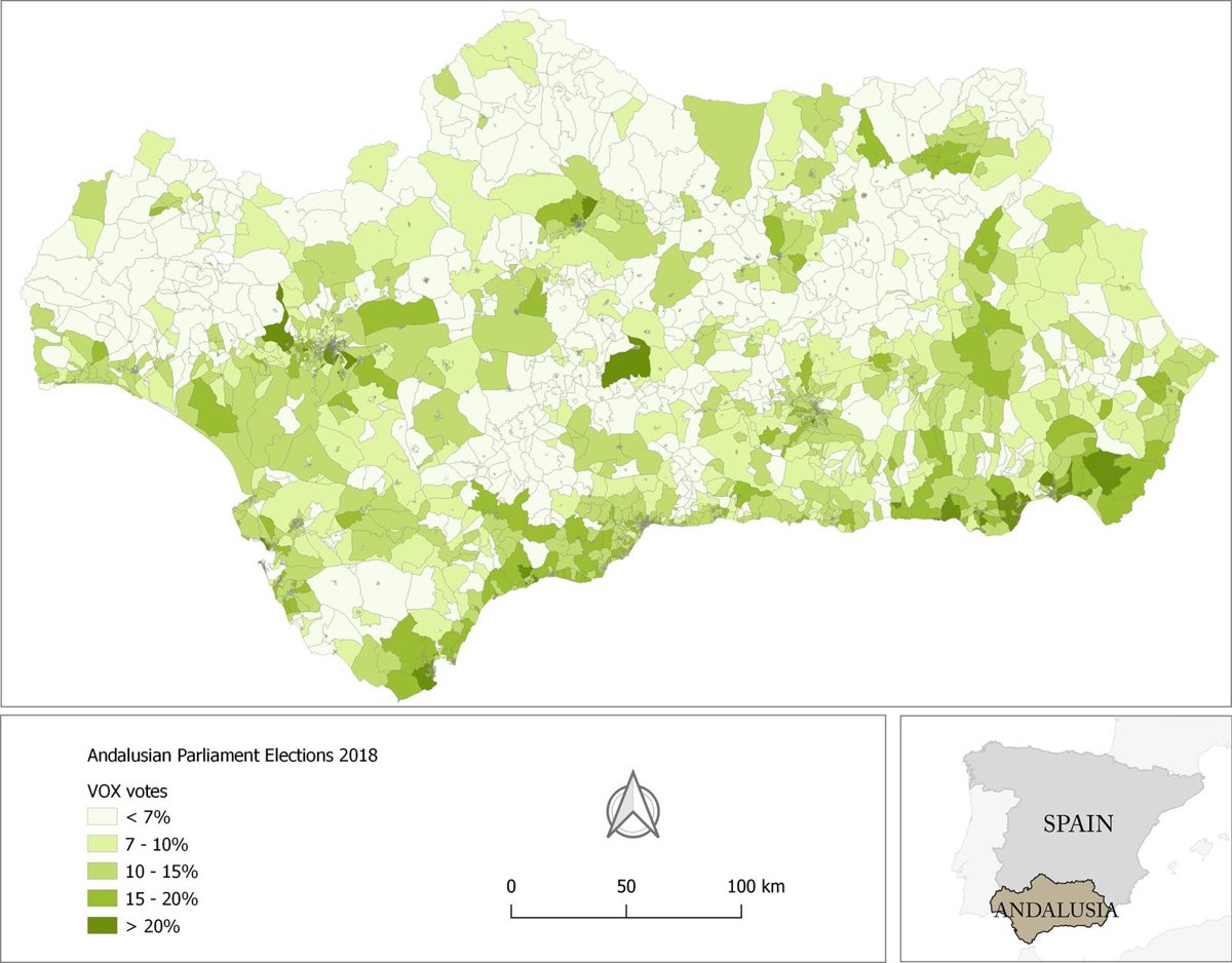 Un estudio liderado por la Universidad Pablo de Olavide analiza la distribución geográfica del voto a Vox en Andalucía, así como los principales factores que explican su crecimiento electoral en las elecciones autonómicas de 2018, llegando a la conclusión de que dicho ascenso en territorio andaluz "no sigue el patrón observado en otros países europeos, al darse el mayor apoyo a la extrema derecha en las secciones censales con una alta proporción de personas con alto nivel educativo, un menor apoyo electoral en zonas de alta concentración de población magrebí, junto con una falta de relación con el desempleo".