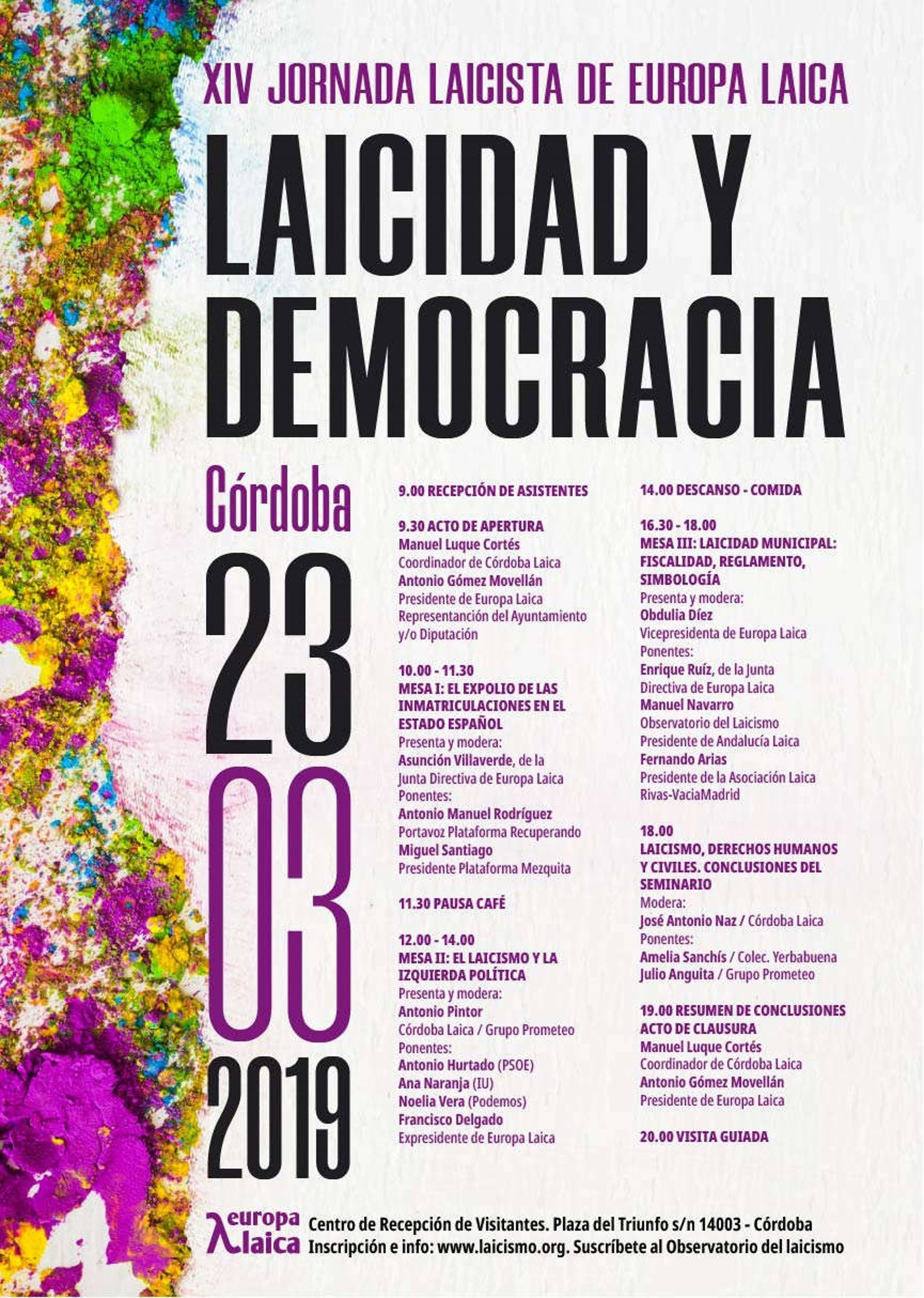 La Jornada Laicista se cerrará informando sobre las conclusiones del seminario sobre 'Laicismo, derechos humanos y civiles', celebrado en Córdoba entre 2018 y 2019, organizado por la Delegación de Participación Ciudadana del Ayuntamiento de la ciudad, con los colectivos Córdoba Laica, Asamblea de Mujeres Yervabuena, Plataforma Lgtbi, Colectivo Prometeo y APDH-Andalucía.
