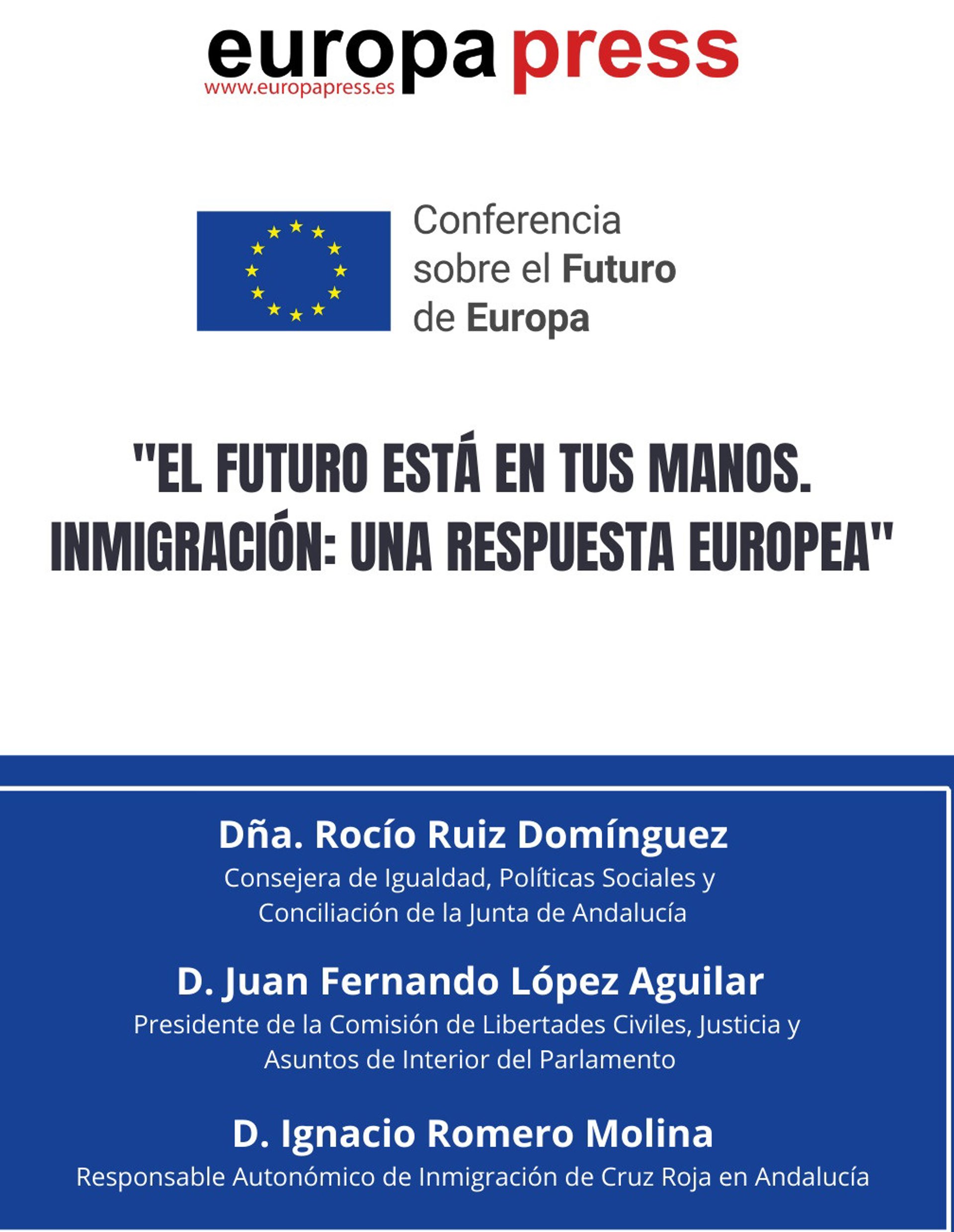 Europa Press Andalucía celebra este viernes, 11 de febrero en Sevilla, un encuentro informativo organizado en colaboración con el Parlamento Europeo con motivo de la Conferencia sobre el Futuro de Europa (Cofoe), que contará con la participación de la consejera de Igualdad, Políticas Sociales y Conciliación de la Junta de Andalucía, Rocío Ruiz; el eurodiputado socialista y presidente de la Comisión de Libertades Civiles, Justicia y Asuntos de Interior del Parlamento europeo, Juan Fernando López Aguilar, y el responsable autonómico de Inmigración de Cruz Roja en Andalucía, Ignacio Romero Molina.