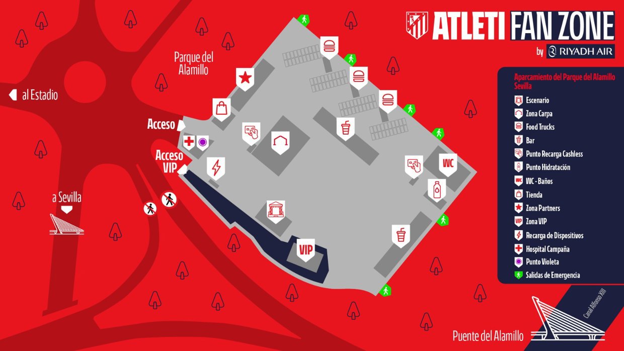 En este sentido, los seguidores del Atlético de Madrid dispondrán de su fan zone en el Parque del Alamillo, situado a unos 15 minutos a pie del Estadio de La Cartuja. El acceso al estadio desde este punto se podrá realizar únicamente a pie o en autobús. En este último caso, las principales opciones son las líneas 2 y C2: la línea 2 cuenta con parada en Américo Vespucio-Facultad de Comunicación, mientras que la C2 tiene parada en Juan Bautista Muñoz (Estadio Olímpico). Esta zona contará con pantallas para seguir el partido y permanecerá abierta durante toda la jornada, hasta la 1,00 de la madrugada.