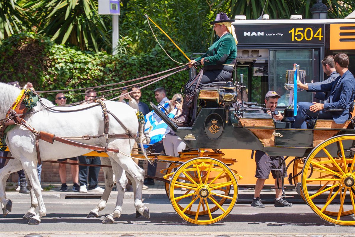 El excapitán del Atlético de Madrid, Gabi, y el excentrocampista de la Real Sociedad, Xabi Prieto, trasladan, en coche de caballo, la Copa del Rey al Palacio de San Telmo en Sevilla.- FRANCISCO J. OLMO / EUROPA PRESS