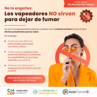 El Consejo Andaluz de Colegios Oficiales de Farmacéuticos (Cacof) ha lanzado una nueva campaña informativa con motivo del Día Mundial Sin Tabaco, que se celebra este próximo 31 de mayo con el fin de concienciar a la sociedad sobre los "graves efectos" perjudiciales contra la salud que implica fumar, así como las graves enfermedades y patologías que puede provocar, centrándose de forma especial este año en los vapeadores o "nuevas formas de fumar".