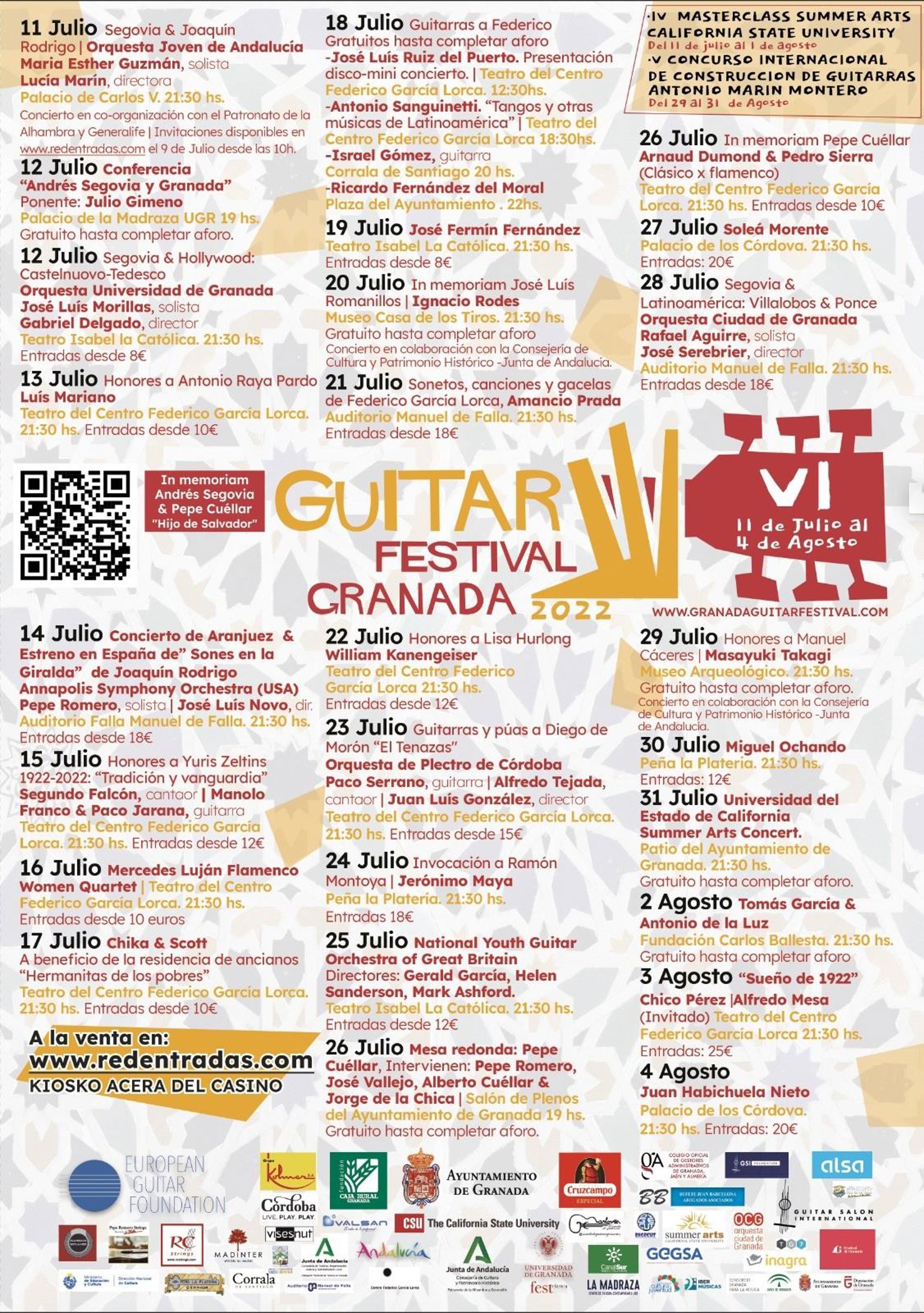 El festival vuelve a mantener su colaboración con la Orquesta Ciudad de Granada (OCG), realizando este año un concierto en torno a los conciertos latinoamericanos encargados por Segovia con uno de los grandes de la dirección, José Serebrier, y con Rafael Aguirre como solista; y que mantiene también la relación con la Peña La Platería, que servirá de escenario para la celebración de dos conciertos. Otro aspecto destacado de la programación serán las conferencias, como la dedicada a 'Andrés Segovia y Granada' que ofrecerá Julio Jimeno o la mesa redonda sobre José Cuellar en la que participarán Pepe Romero, José Vallejo y Alberto Cuéllar.