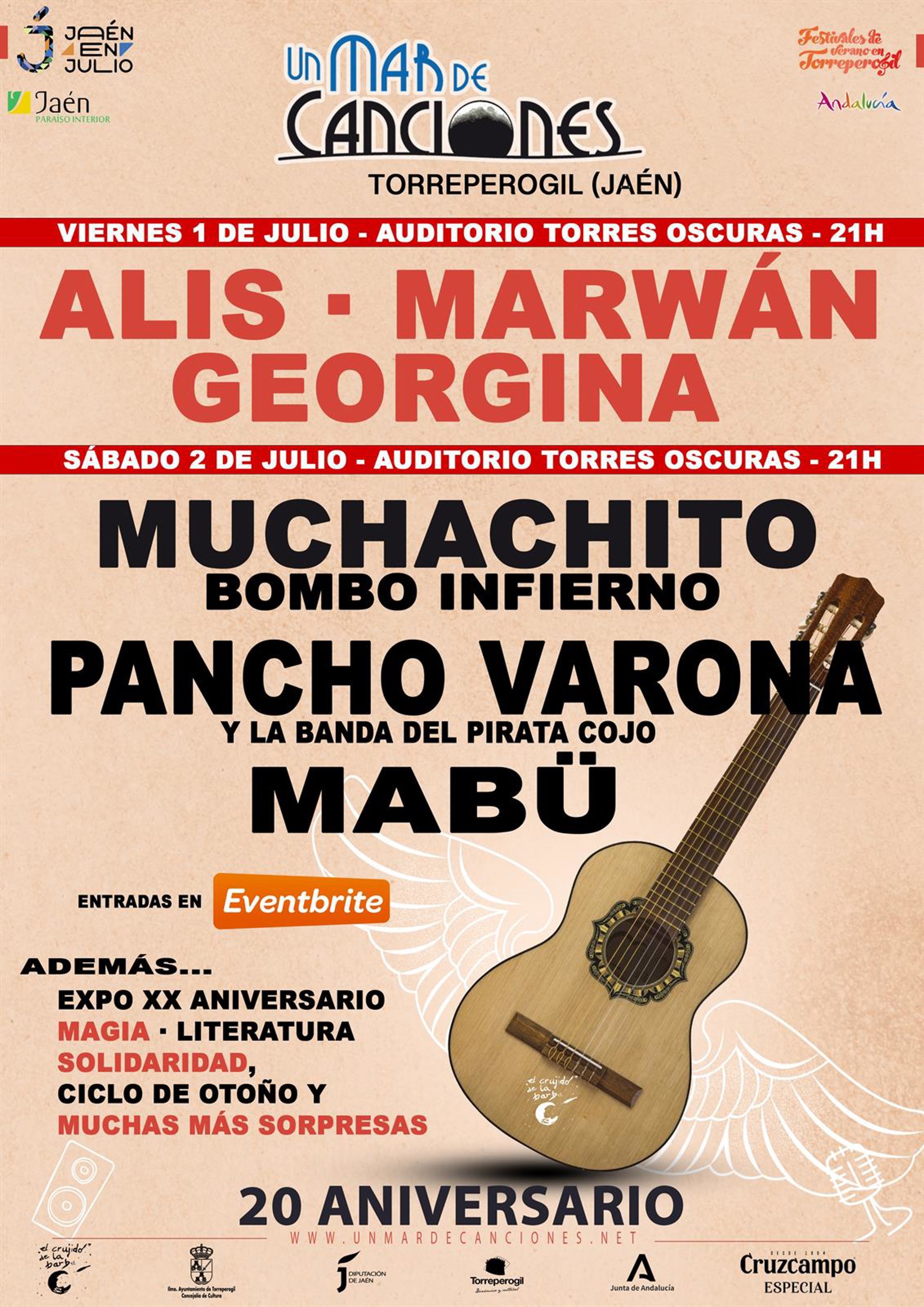 El viernes 1 de julio subirán al escenario Alis, Marwán y Georgina, mientras que el sábado actuarán Muchachito Bombo Infierno, Pancho Varona y la Banda del Pirata Cojo y Mabü. Los conciertos comenzarán a las 21,00 horas y las entradas puedes adquirirse en Eventbrite.