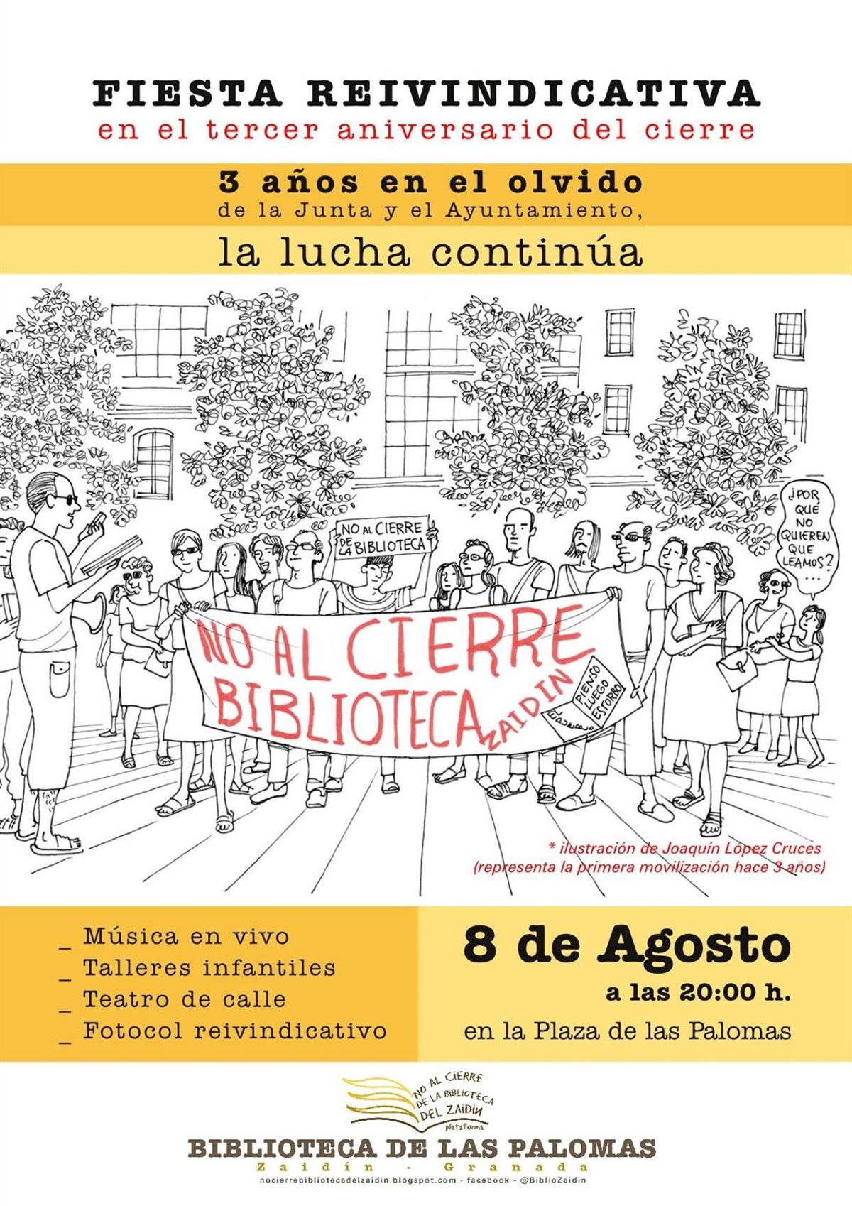 Vecinos del barrio granadino del Zaidín han organizado para este viernes día 8 una fiesta reivindicativa para pedir de nuevo la reapertura de la biblioteca de Las Palomas, cuando se cumplen tres años de su cierre, ordenado por el Ayuntamiento de Granada.