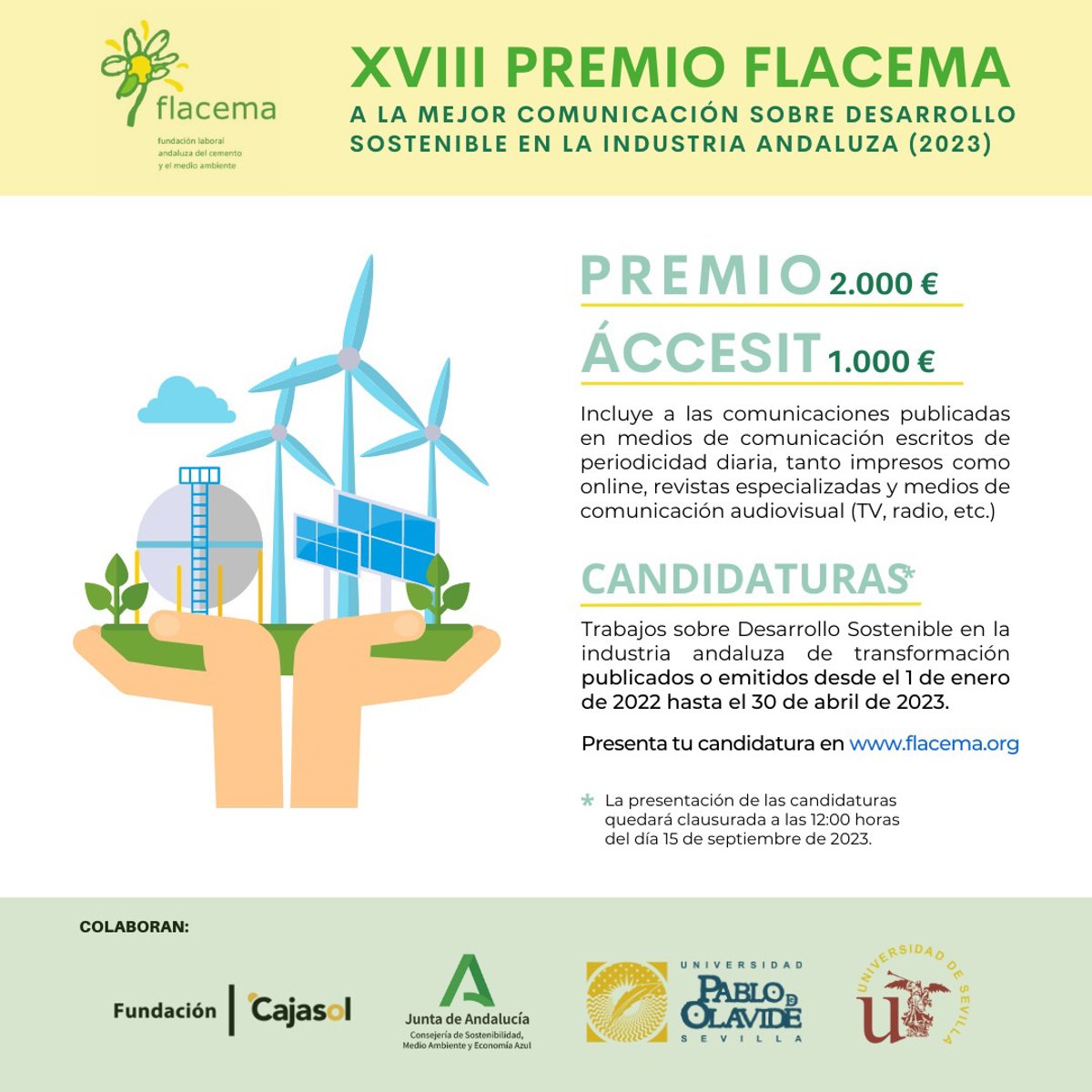 La Fundación Laboral Andaluza del Cemento y el Medio Ambiente (Flacema) ha convocado la XVIII edición del 'Premio Flacema a la Mejor Comunicación sobre Desarrollo Sostenible en la Industria Andaluza'. El certamen está dotado con un primer premio de 2.000 euros y un accésit de 1.000 euros, y el plazo de presentación de los trabajos periodísticos permanecerá abierto hasta el próximo 15 de septiembre de 2023.