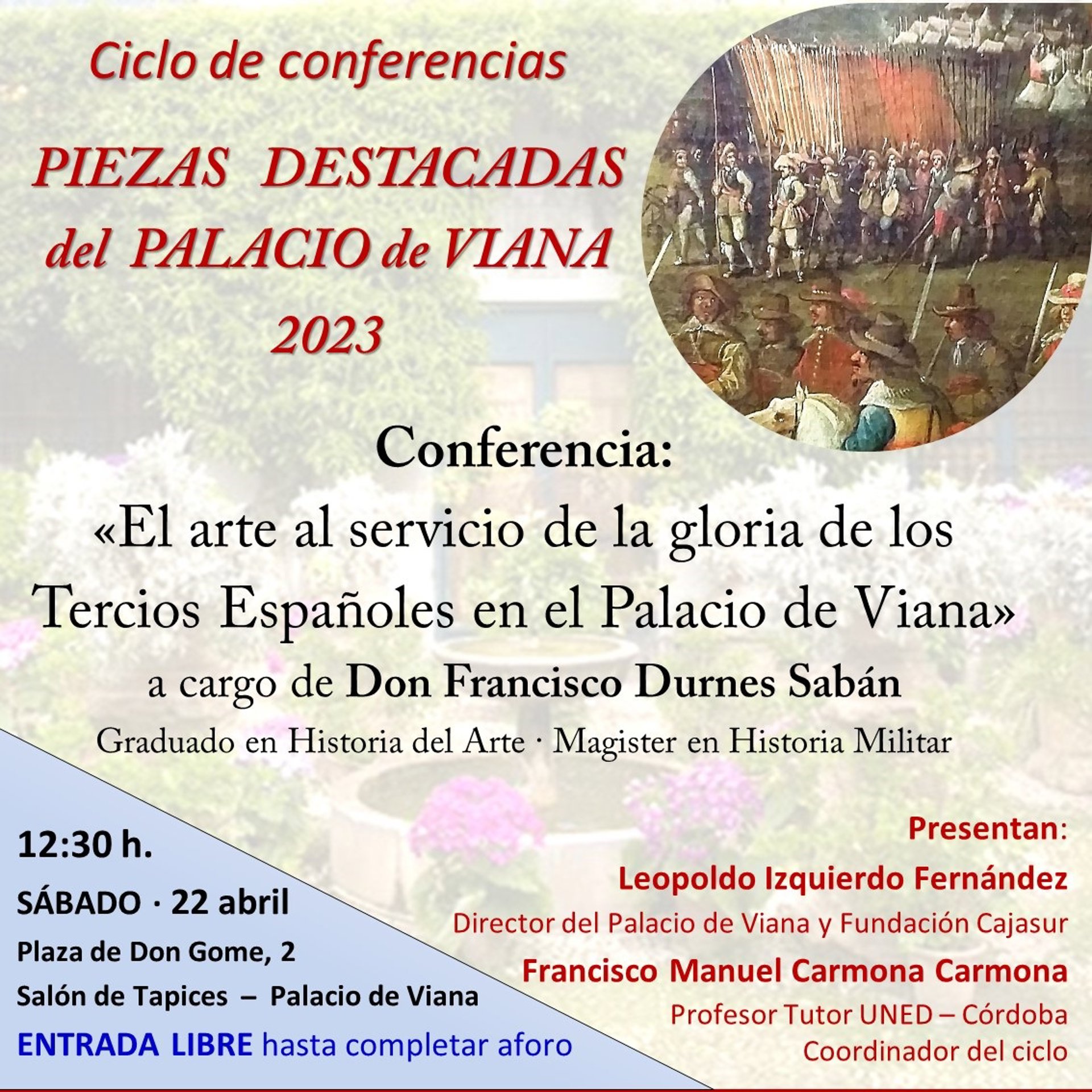 El Salón de Tapices del Palacio de Viana de Córdoba acogerá, a las 12,30 horas de este sábado 22 de abril y organizada por la Fundación Cajasur, la conferencia 'El arte al servicio de la gloria de los Tercios Españoles en el Palacio de Viana', dentro del ciclo 'Piezas destacadas del Palacio de Viana'.