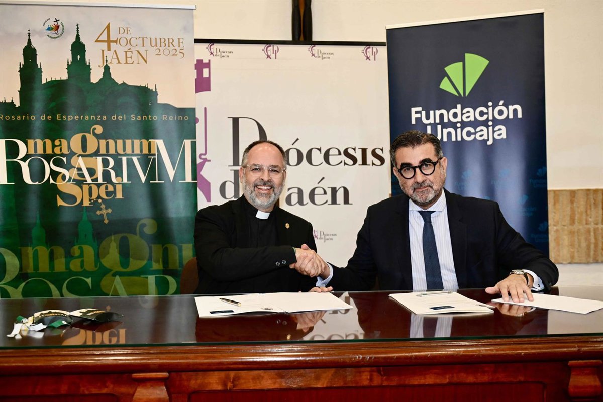El director de Actividades Culturales de la Fundación Unicaja, José María Luna, y el provicario general de la Diócesis de Jaén, José Antonio Sánchez, han suscrito un acuerdo de colaboración para apoyar esta procesión Magna que se enmarca en la celebración del Jubileo de la Esperanza 2025.