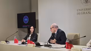 Carmen Nestares, con el rector de la UGR, Pedro Mercado, en imagen de archivo en la presentación de la segunda entrega del ciclo 'Distinguido/as Alumni' - PERFIL DE LA UGR EN LA RED SOCIAL 'X'