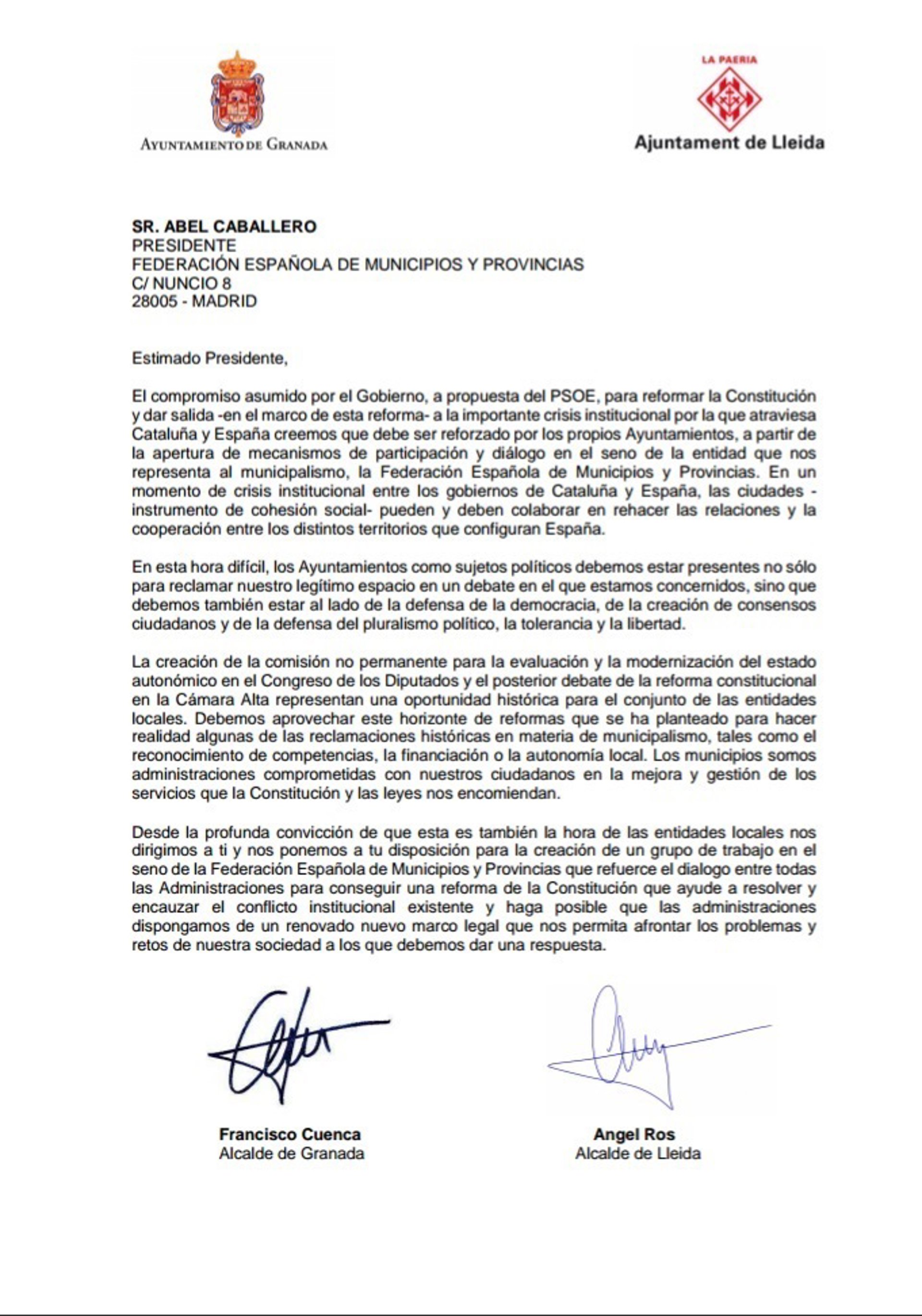 Los alcaldes de Granada y Lleida, los socialistas Francisco Cuenca y Àngel Ros, han solicitado formalmente a la Federación Española de Municipios y Provincias (FEMP) que abra mecanismos para que los ayuntamientos participen en conseguir una reforma de la Constitución que ayude a "encauzar" el conflicto en Cataluña y a la vez dé respuesta a reclamaciones históricas en materia de municipalismo.