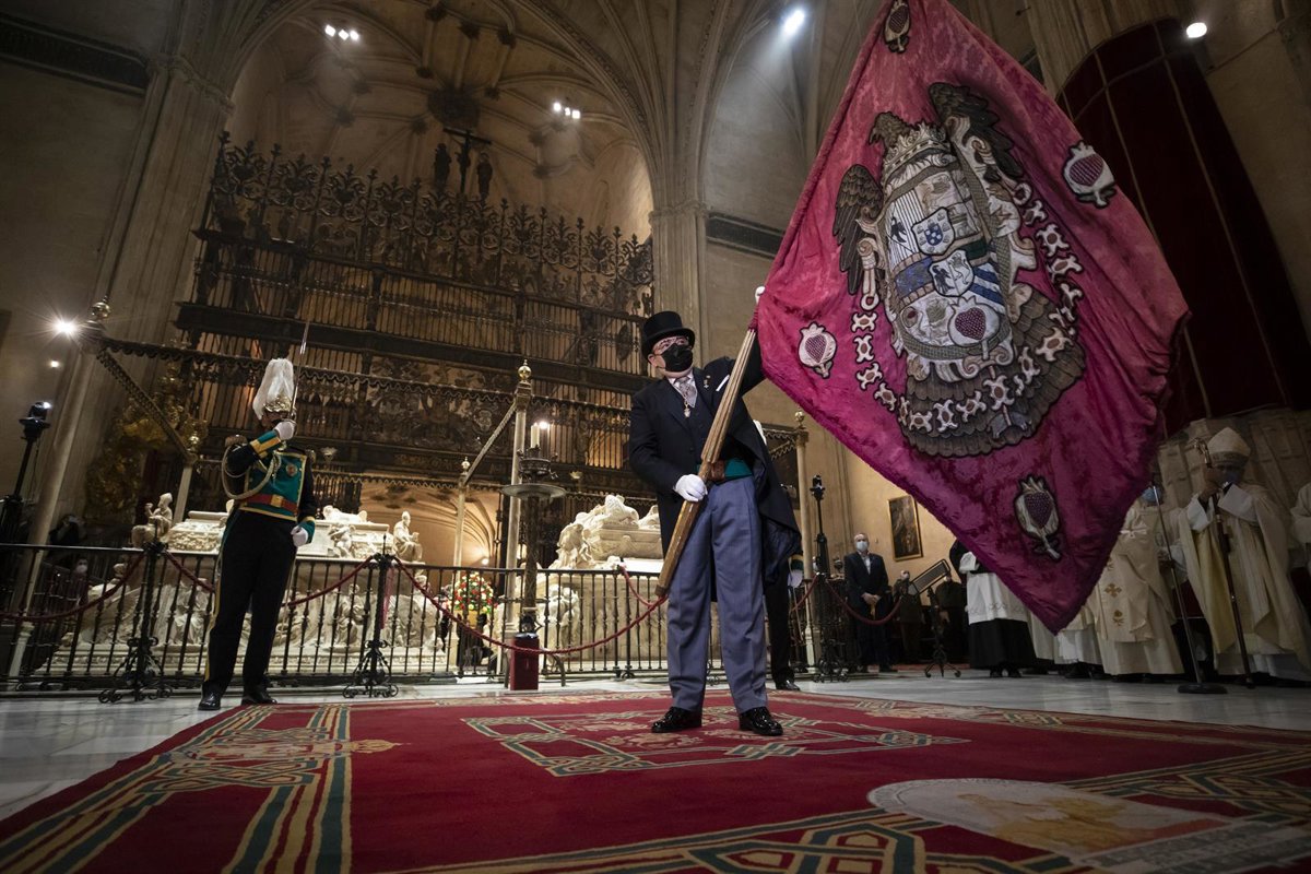 Es el acto principal de los que se celebran en el marco del V Centenario del Traslado de los Restos de los Reyes Católicos, después de que, este pasado martes, se inaugurara la nueva iluminación de la fachada principal de la Capilla Real, donde están los sepulcros reales de Isabel y Fernando, ante los que este miércoles se ha tremolado el estandarte de Castilla, que ha salido del Ayuntamiento como suele hacerse tradicionalmente el Día de la Toma, el 2 de enero, y se ha hecho una ofrenda floral.