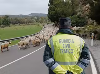 La Guardia Civil ha auxiliado a un pastor trashumante en el traslado de su rebaño de ovejas desde la presa de Rules hasta el puente de los Siete Ojos por la carretera A-346, que es la que une las localidades de Vélez de Benaudalla con Órgiva (Granada).