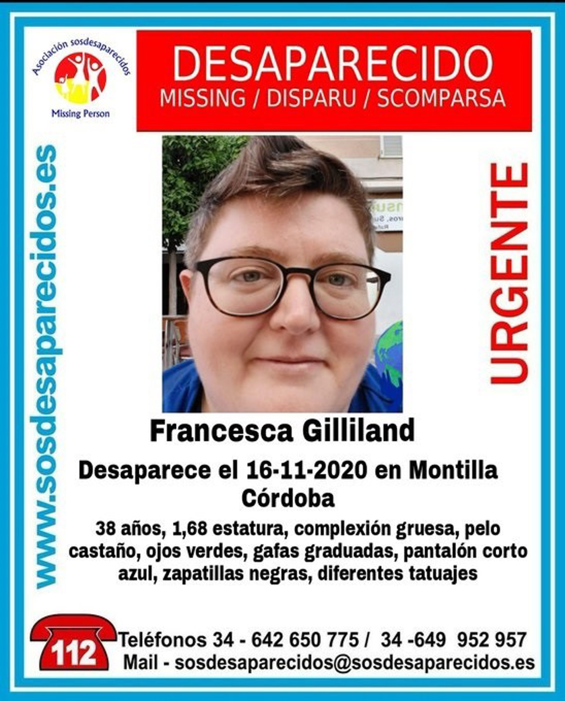 La Guardia Civil de Córdoba ha informado de que, tras tener conocimiento este lunes de la desaparición de Francesca Gilliland, una mujer de 38 años de la que se perdió la pista de su paradero en el municipio cordobés de Montilla, ha establecido un dispositivo de búsqueda en la localidad y alrededores de la misma en el que se integraron, además de guardias civiles, Policía Local y efectivos de Protección Civil con perros adiestrados en la búsqueda de personas, Cruz Roja y varios voluntarios.