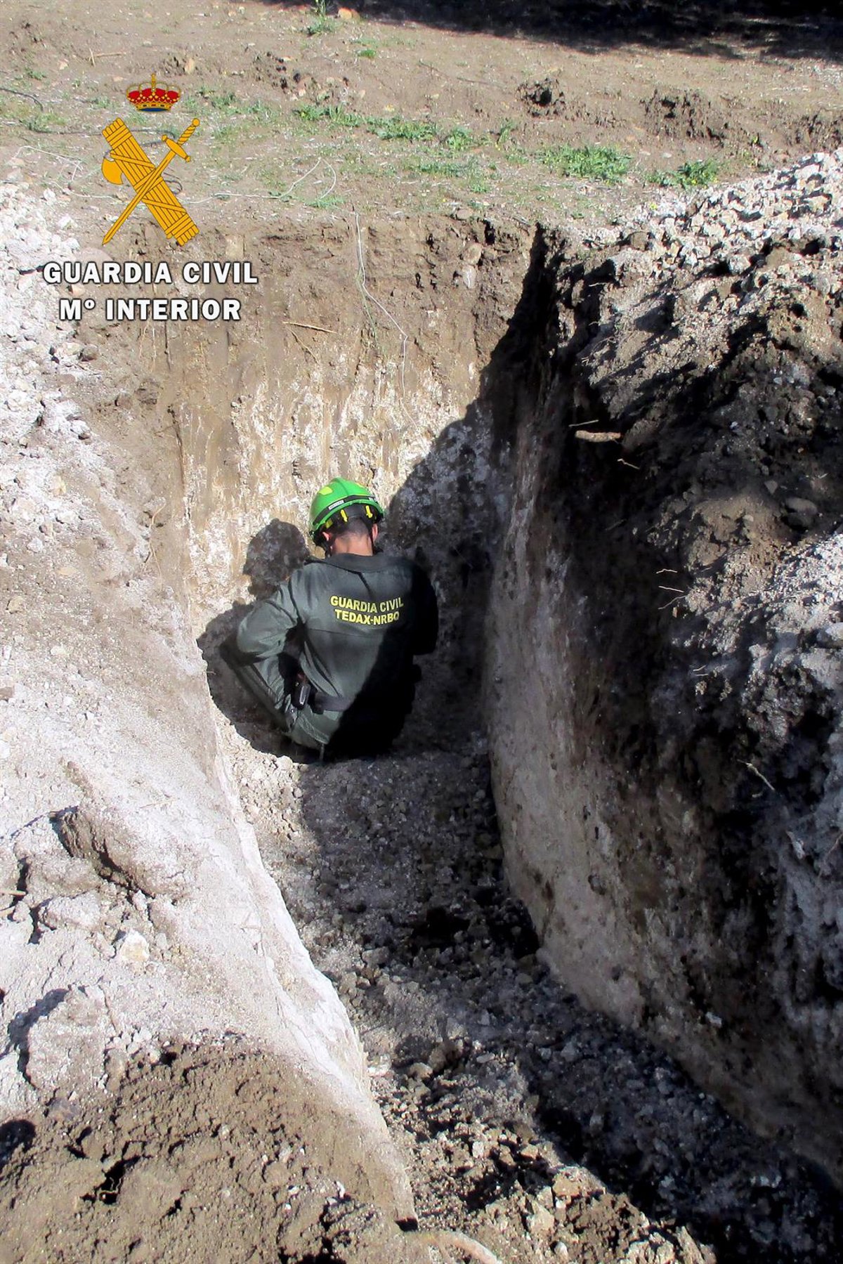 La Guardia Civil, a través de sus especialistas Tedax-NRBQ desplazados desde Granada, han neutralizado un proyectil de artillería hallado por un agricultor en un olivar de Lopera (Jaén).