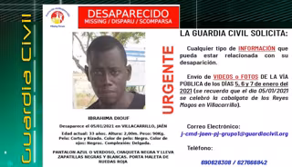 La Guardia Civil continúa con la investigación centrada en la desaparición del ciudadano senegalés Ibrahima Diouf, de 33 años, visto por última vez en Villacarrillo (Jaén) el día 5 de enero de 2021, donde trabajaba como temporero en la recogida de aceituna. Para poder seguir avanzando en la investigación, la Guardia Civil ha pedido colaboración ciudadana.