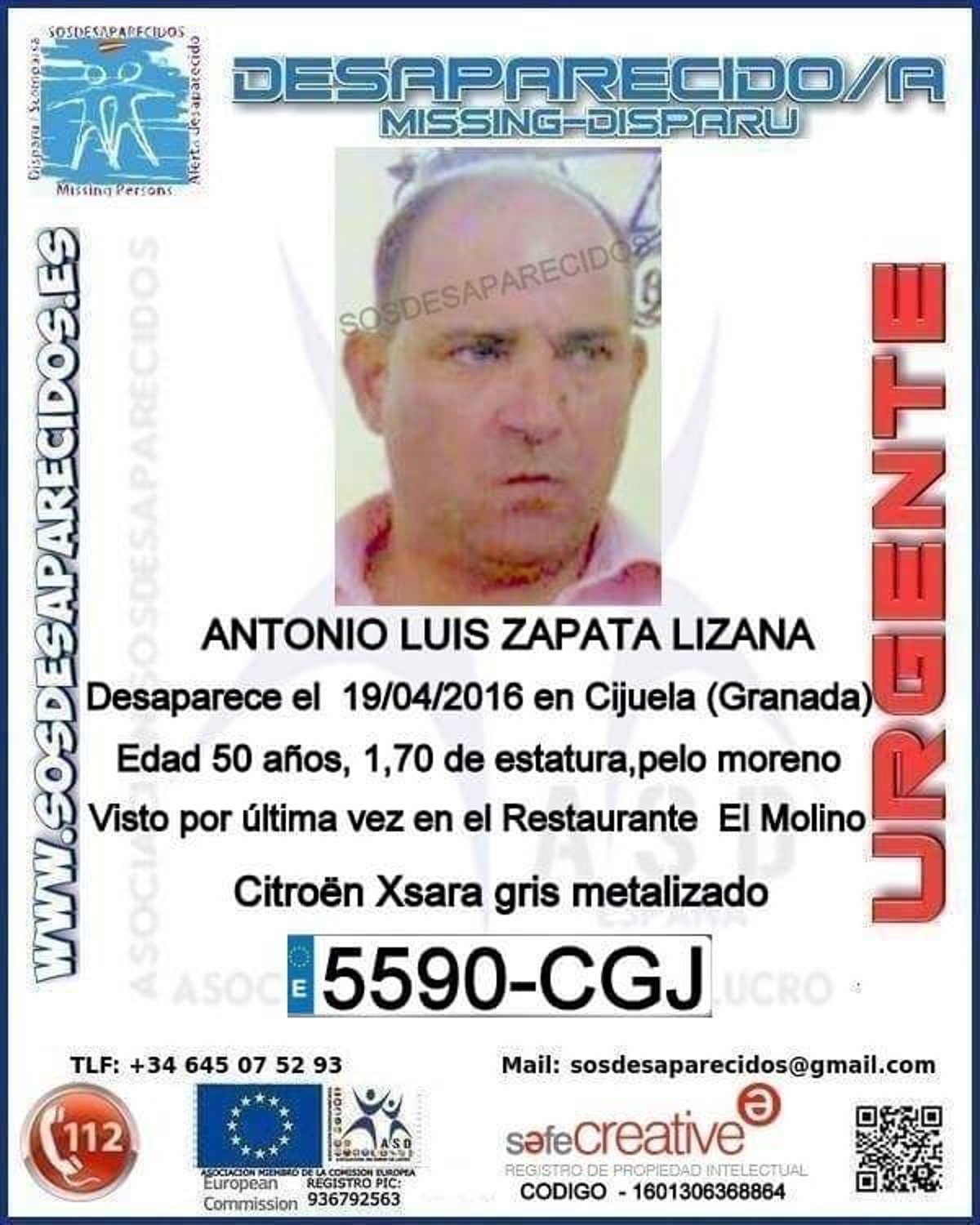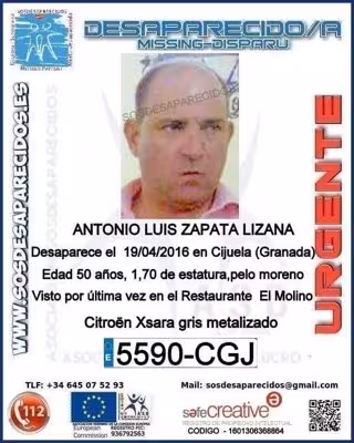 Según informa la Guardia Civil en su perfil de 'Twitter' (@guardiacivil), se trata de Antonio Luis Zapata Lizana, que fue visto por última vez en el restaurante El Molino.
